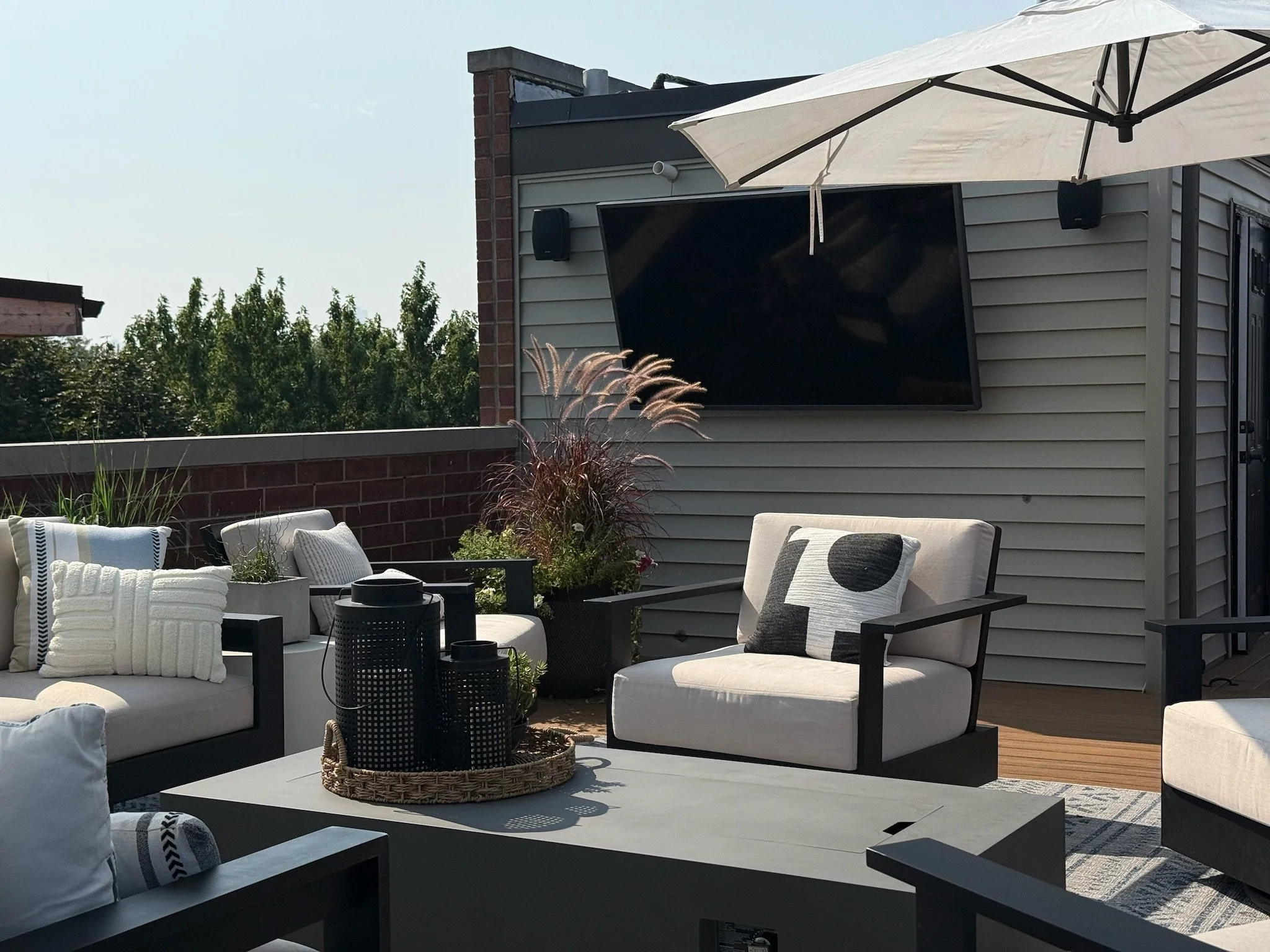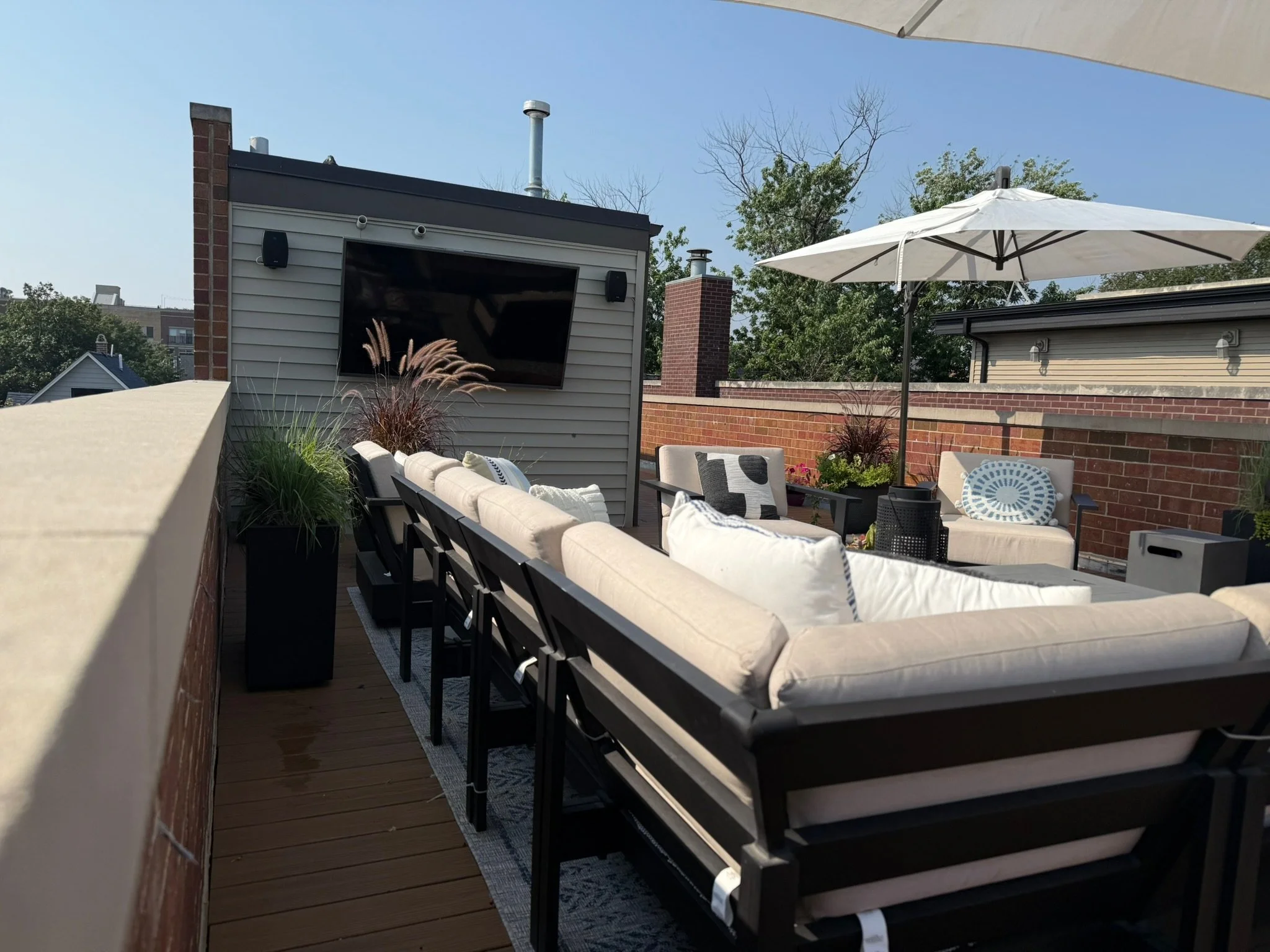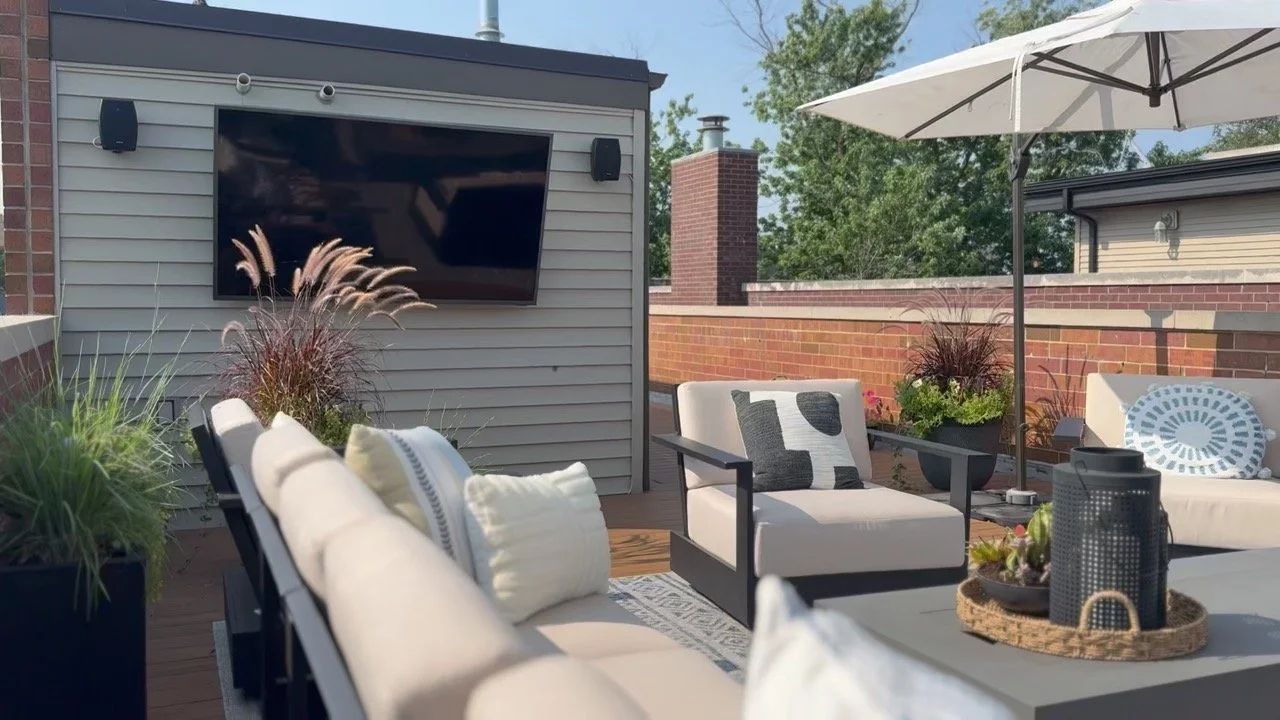 Designed and installed by Enfuze, this rooftop system delivers balanced sound, seamless Wi-Fi, and outdoor TV integration — turning a single-zone rooftop into the ultimate space for music, movies, and game-day hosting.